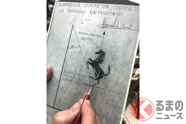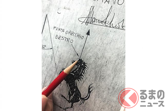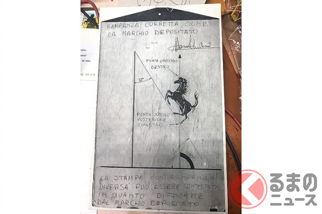 作業場に一枚の、少し年季の入ったフェラーリの跳ね馬のイラストが貼ってあった。しかも何やら角度や矢印が提示してある。