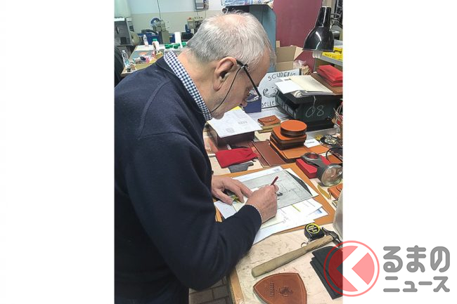 なんだろう? 現社長のシモーネ・スケドーニに「これは一体なに?」と質問したところ、「登録商標されているフェラーリの跳ね馬のオフィシャルのイラストだよ。くわしい話は、当時の社長だった父マウロに話を聞くといいよ、彼はストーリーの背景をぜんぶ知っているから。いま、ちょうど会社に顔を出したところだよ」と、シモーネに教えてもらった。そこでさっそく、マウロの作業場へ向かった。