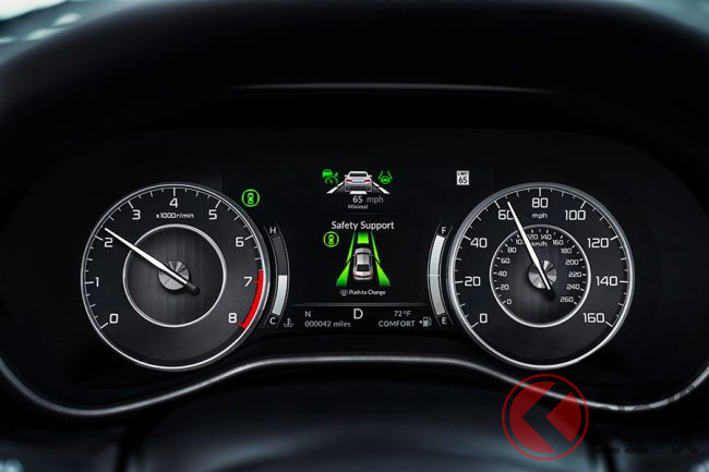 運転支援システムとして、最新の「アキュラウォッチ」を標準装備。渋滞時に先行車の追従しながら車線中央を維持するようにステアリング操作をアシストする「トラフィックジャムアシスト(渋滞運転アシスト機能)」と、走行中に認識した道路標識情報をメーター内などに表示する「標識認識機能」を搭載しました。