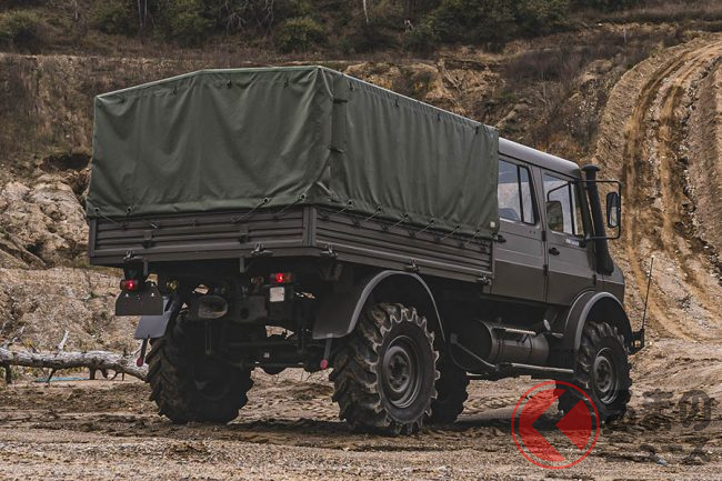 ウニモグのラインナップは、さまざまな作業用アタッチメントを取り付け、農業用などの作業をおこなうための多目的作業型ウニモグと、通常のクロスカントリー4WDでも走行できないような悪路を走破する機動性を重視した高機動型ウニモグがあり、出品車はもちろん後者である。
