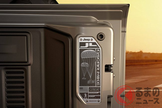 エクステリアでは、米軍を連想させる星型デカールをボンネットとリアクォーターパネルに採用したほか、テールゲートの「OSCAR MIKE(オスカーマイク)」ハードバッジや、パラシュートとジープのイラストをあしらった特製プレート、フロントフェンダーのUS国旗デカールなど、ミリタリーテイストの専用アクセサリーが随所に付加されているのが特徴だ。