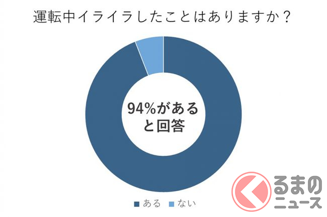 「運転中にイライラしたことはありますか?」という質問では、なんと94.1%もの人が、イライラした経験があると回答。