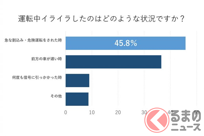 運転中にイライラした経験がある人を対象に、どのような状況だったか質問したところ、「急な割込みなど、危ない運転をされた時」が45.8%、「前方のクルマが遅い」が36.5%、「何度も信号に引っかかった時」が9%でした。