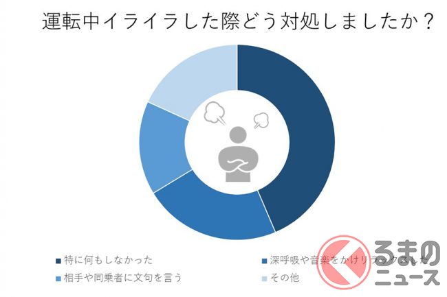 回答から多くの人はイライラした際に、何もしないで見過ごすか、車内でストレスを発散するなど、トラブルを避けるようにする傾向があることがわかりました。