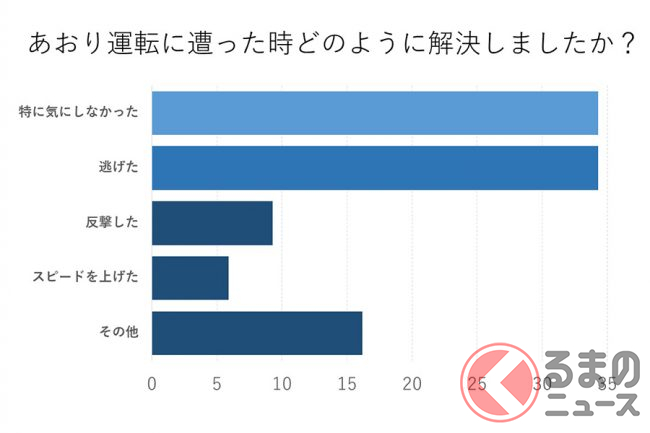 さらに、「運転中にあおり運転に遭ったことはありますか?」という質問に「ある」と答えた人の多くは「とくに気にしなかった」が34.3%、「一旦停車・速度を落とし、道をゆずった」が34.3%など、冷静な対処によりトラブルへの発展を避ける結果となっています。