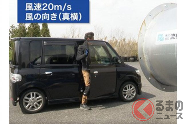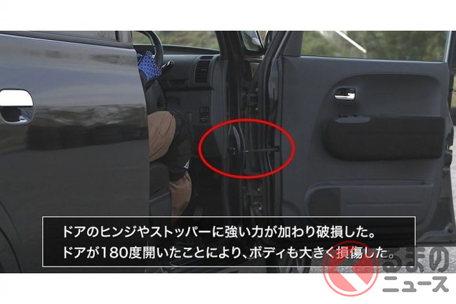 検証の結果、風速40m/sでは、真横からの風でクルマから降車できず、後方からはドアを開けた瞬間に約180度近くまで開いてしまい損傷となりました。