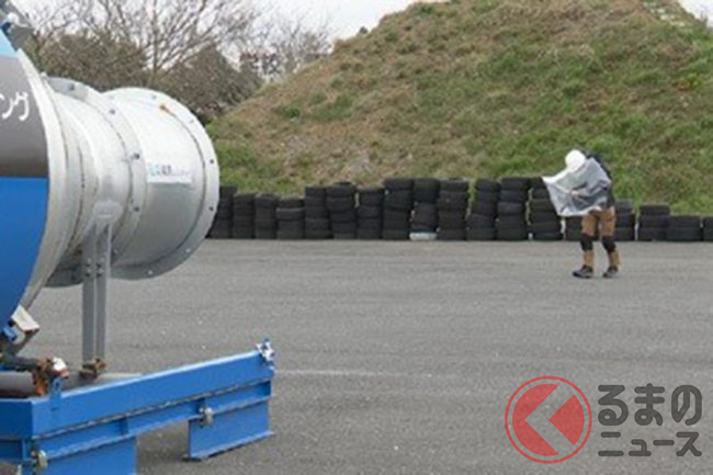そこでJAFは、強風時のクルマの乗降や自転車走行、歩行者への影響や危険性について大型送風機を使用し検証しました。