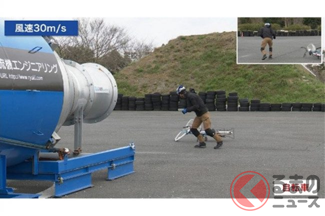 検証結果は、自転車では風速20m/sの地点で走行不能。歩行者は、風速20m/sで傘が壊れ、風速50m/sで前進できなくなりました。