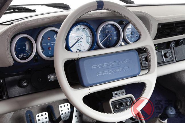 メーター類もDSCがインテリアの配色に合わせて組みなおし、1980年代に日本へ輸入された911ターボの速度計の同心円状のリングのディテールが、回転計にオマージュされている。