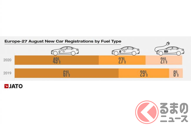 さらに2020年8月は、電動車が業界にとっての救いとなっており、JATOのデータによると欧州全体で前年同月比121%増となる18万8700台の電動車が販売されており、これまでで最高となる21.4%のマーケットシェアとなりました。