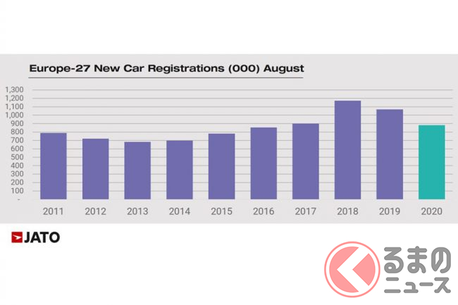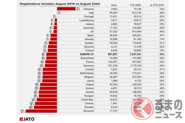 JATO Japan Limitedが2020年8月の欧州の自動車市場についてのレポートを公開し、販売台数が前年同月比18%減であったと発表しました。