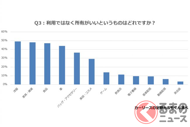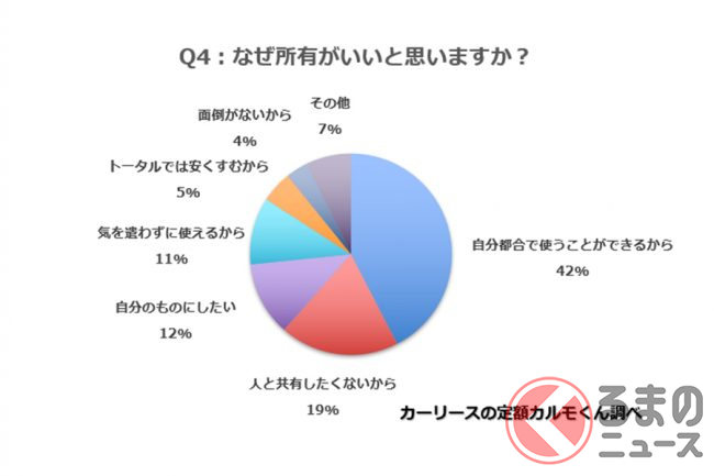 また、全体の4番目に利用がいいとされていた「クルマ」は所有でも4番目という結果で、「いつでも好きな時に使える」や「荷物を車内に置きっぱなしにできる」など、「自分都合で使うことができるから」という理由を挙げた人が42%です。
