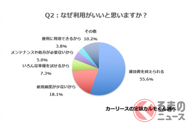 「使用頻度が少ないから」と回答した18.1%には、「あまり使わず、購入するほどの必要はない」や「常に必要としているわけではない」などの回答、「いろんな車種を試せるから」と答えた7.3%には、「乗り換えがしやすい」や「毎回最新型に乗れる」などの回答がありました。