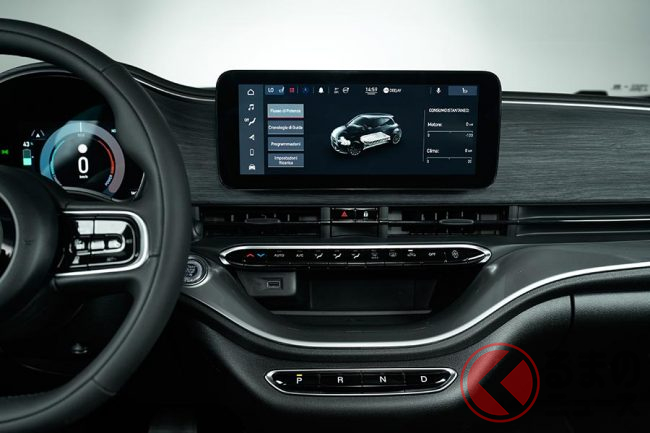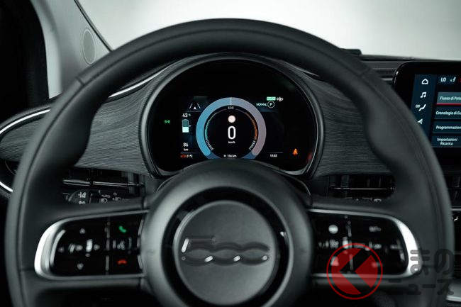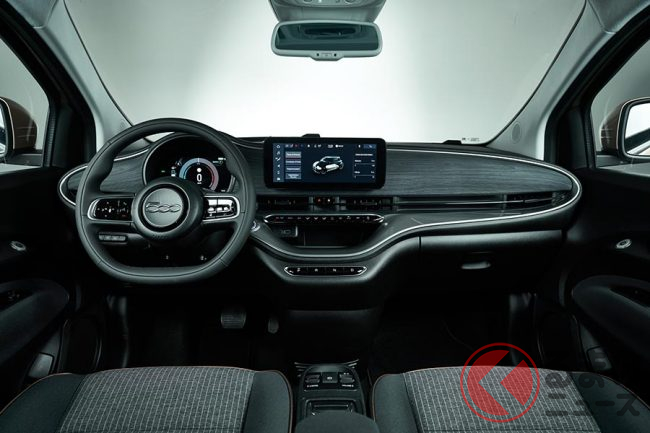 ICONは、新型500の最上級グレード。バッテリー容量やモーター出力はPASSIONと同様だが、インテリアには10.25インチのタッチスクリーンディスプレイを備えたり、ダッシュボードとステアリングホイールには、本革ではなくビーガン素材であるナチュラルウッド素材を使用したりと、最上級グレードにふさわしい内容となっている。