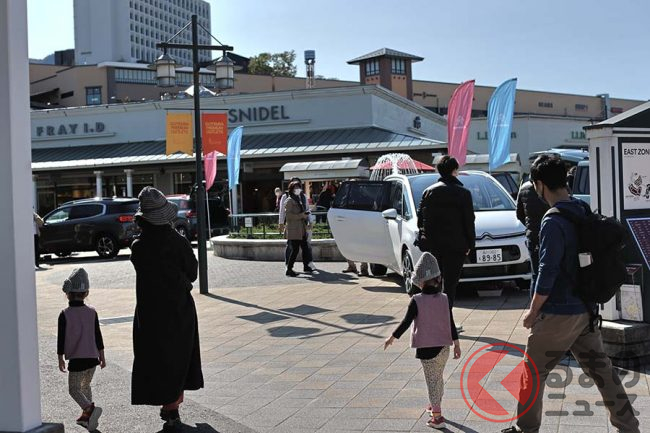 以前は休日になると外国人観光客も大勢足を運んでいた御殿場プレミアムアウトレットだが、現在は新型コロナ禍により、その多くが日本人。それでも秋の行楽シーズンということもあり、噴水広場前には多くのファミリーやカップルで盛況だった。