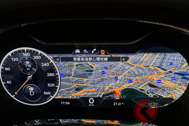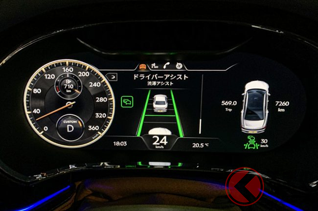 走行中に、それらがちゃんと機能しているかどうかを確かめるのには表示を確認するしかないから、表示は大きく見やすく、わかりやすくなければならない。新型フライングスパーは申し分ない。たとえ、スピードメーターとタコメーターの中間部分にドライバーアシスト画面を選ばず、他の表示を利用していたとしても、右側のタコメーター下部にも小さく表示されるから安心だ。タコメーターの代わりにナビゲーションの地図画面を表示させていたとしても、それは変わらないから万全だ。