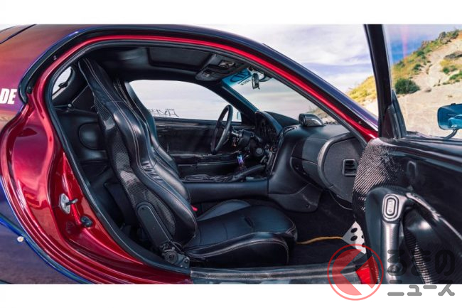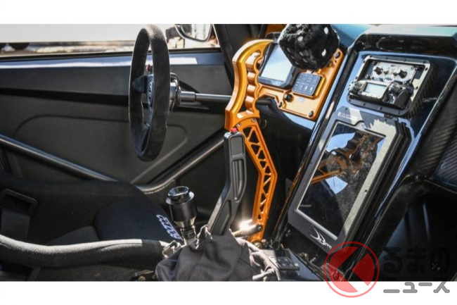 インテリアはラリークロス競技などで使用されているのと同じロールケージをインストールしており、フルバケットシートは3つ配置。サイドブレーキのレバーなどはデバーティ氏がオリジナルでデザインし、実際に販売しているものを用いています。
