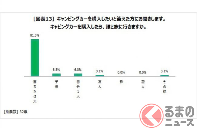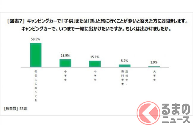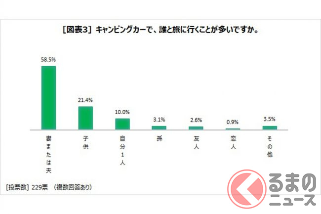 続いて、キャンピングカーで一緒にくるま旅に出掛ける人を調査したところ「妻または夫」と回答した人の割合は58.5%。夫婦ふたりで、ゆったりと旅を楽しむ人が多い傾向にあるようです。