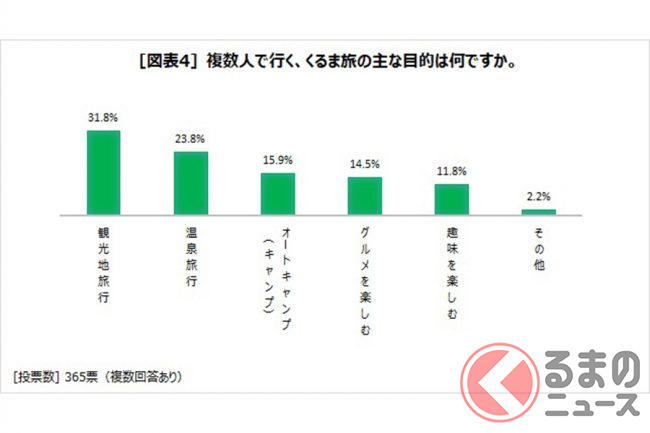 家族はもちろん、複数人で楽しむくるま旅の目的については、もっとも多かったのが観光地旅行で31.8%。次いで人気なのが温泉旅行で23.8%という結果となりました。
