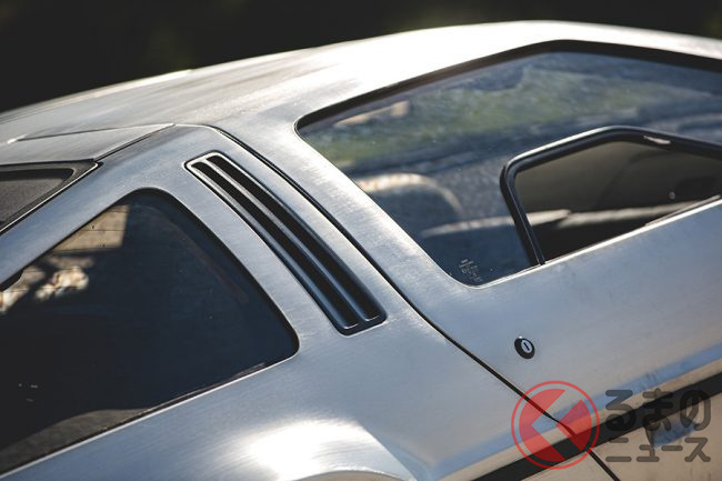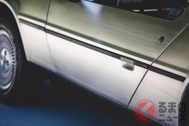 「デロリアン」の名で知られている「DMC−12」。ステンレス製の、細かな傷のようにも見えるヘアラインがたくさん入ったシルバーのボディが印象的なモデルだ。