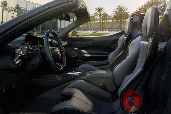 チーフ・マーケティング・オフィサーのエンリコ・ガリエラ、チーフ・テクニカル・オフィサーのマイケル・リヒター、そしてリモートで参加したチーフ・デザイン・オフィサーのフラビオ・マンゾーニと、現在のフェラーリを率いるメンバー達によって披露されたニューモデルは、基本的には「SF90ストラダーレ」のルーフをRHT=(リトラクタブル・ハードトップ)としたもの。これでフェラーリでは2タイプのプロダクションPHEVの選択が可能になったことになる。