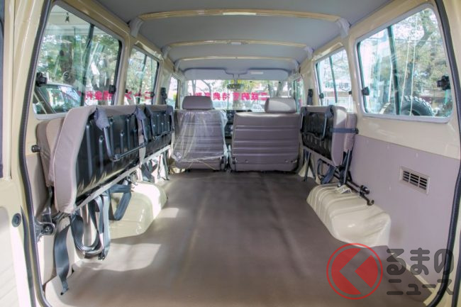 車内後部には折り畳み式の対面シートが装備されており、本来であれば前席と併せて9人乗車が可能ですが、日本の保安基準では3名しか乗ることができません。