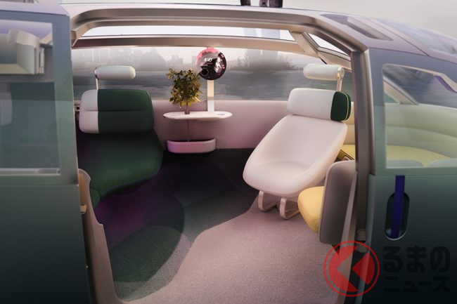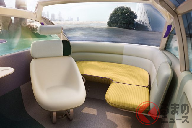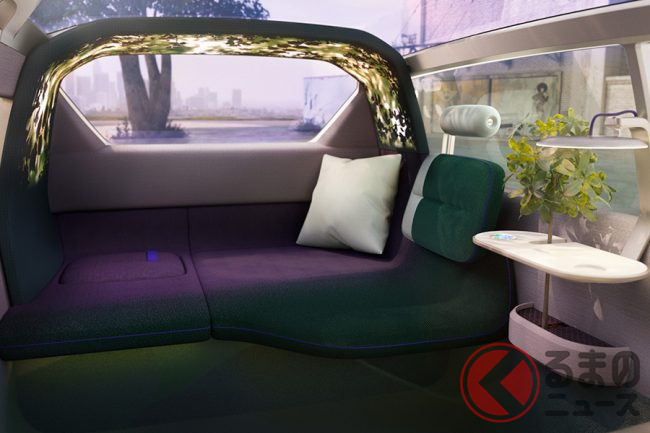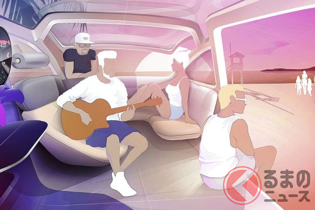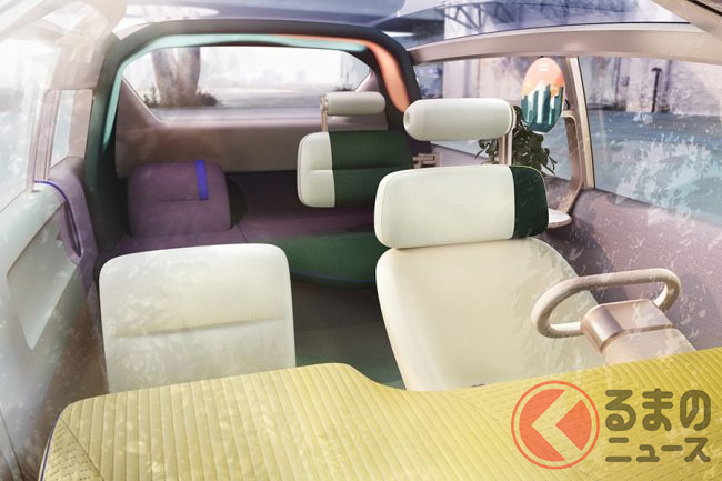インテリアには4席を用意。ふたつのフロントシートは回転するように設計されており、後部のシート背もたれは手動で折りたため、向きを変えることもできる。またクルマが停止しているときはダッシュボードが下がり、運転席エリアは快適な「デイベッド」になる。加えてフロントガラスは上向きに開くことが可能で、一種のストリートバルコニーを作ることができる。