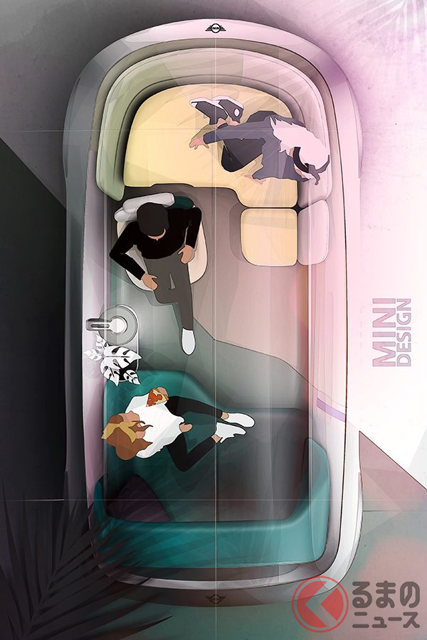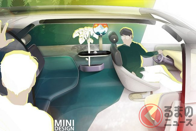 MINIビジョン・アーバノートのインテリアは、旅に出るのに理想的な環境を提供するだけでなく、旅の目的でもあるという。目的地に到着すると、わずか数ステップでリビングルームに変身、乗員はクルマの側面にあるスライドドアからキャビンに出入りすることになる。このデザインは、スペースが限られている都市の運転条件に理想的なデザインとなる。運転席側や助手席側に他のドアはない。