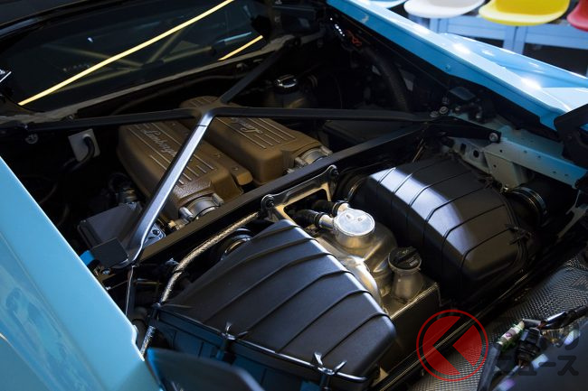 「Corango(コファンゴ)」とは、フロントボンネット・フェンダー・フロントバンパーをひとつのコンポーネントとして一体化したもの。「cofano(イタリア語でボンネット)」と「parafango(イタリア語でフェンダー)」を合わせ、フロントバンパーも組み込んだコファンゴは、「ミウラ」や「セストエレメント」にも同様のものを見ることができる。