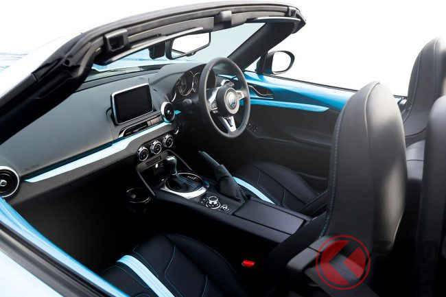 内装の造形はロードスターに準じていますが、オリジナルのシート表皮とされ、インパネまわりのカラーリングもシートに合わせたコーディネートを採用。