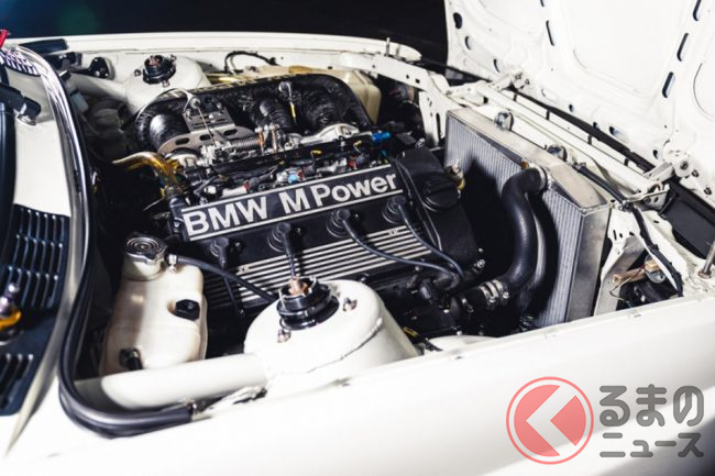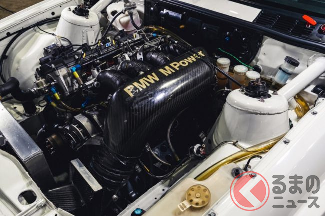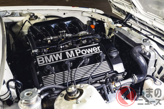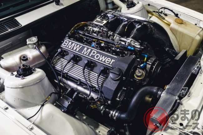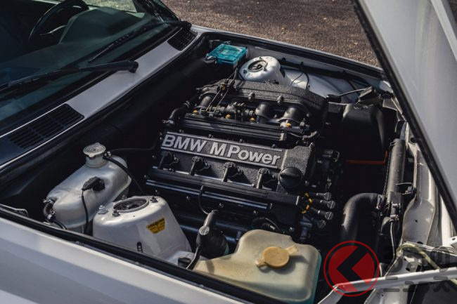 エンジンも専用のものが搭載されている。E30型M3のS14型エンジンは、「635CSi」や「M1」に搭載されていたM88型3.5リッター直列6気筒ドライサンプエンジンから、2気筒を外して2.3リッター直列4気筒としたものだ。