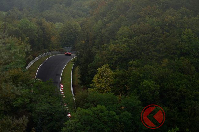その予想は的中。9月の雨のニュルは真冬のような寒さで、冷え切った雨が容赦なく頬や手の感覚を奪っていく。ただし、水煙を上げながら疾走するGT3マシンは本当に美しいので、それを観ると少しだけ寒さを忘れることができる。