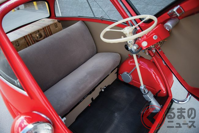 三輪車だと税金が安くなる英国マーケットでは、3輪モデルも販売されたが、今回「THE ELKHART COLLECTION」に出品されたBMWイセッタは300cc版の4輪モデル。