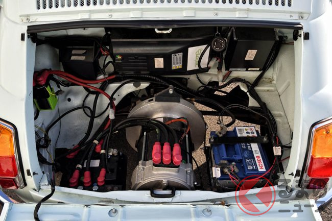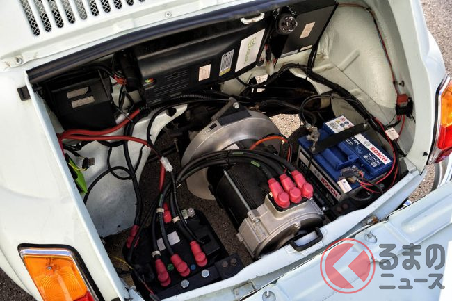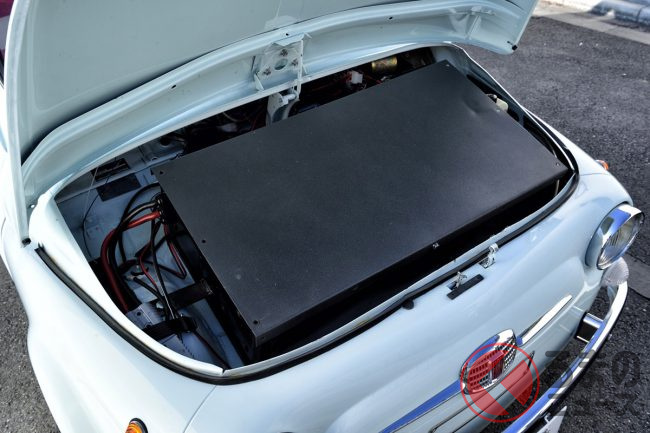 そして、これはその電気自動車バージョン。クルマの内外装やシャシ周りなどをフルレストアし、フロントの燃料タンクの位置にリチウムイオンバッテリーを、リアのエンジンの部分にイタリアのニュートロン社製EVコンバージョンキットを組み込んだチンクエチェント。それをイタリアで製作して日本でも走らせよう、というプロジェクトだ。