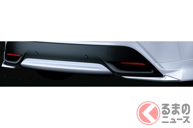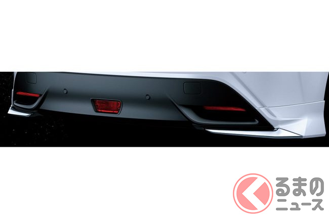 また、「リヤスパッツ&バンパーガーニッシュ」は、フロント、サイド、リヤへと、煌びやかなメッキ加飾の輝きが後方へと走り抜けていくイメージで、リヤロアバンパーカバーに装着するボディ同色の「リヤバンパーガーニッシュ」は、視覚的な重心を下げる効果があります。