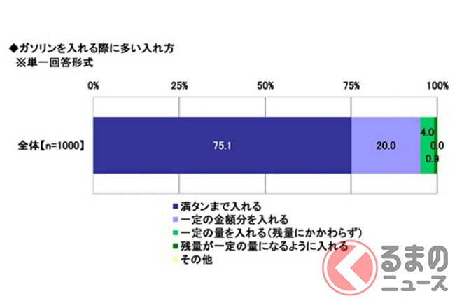 また、ガソリンを入れる際に、どのように入れることが多いかを聞いたところ、「満タンまで入れる」が75.1%、「一定の金額分を入れる」が20%、「一定の量を入れる(残量にかかわらず)」が4%、「残量が一定の量になるように入れる」が0.9%でした。