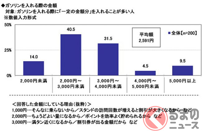 さらに、回答した金額にしている理由を聞いてみたところ、「そんなに乗らないから」(1000円)や「ちょうどよい量になるから」(2000円)、「満タン近くになるから」(3000円)といった回答が挙げられました。