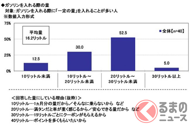 回答した量にしている理由を聞いてみると、「1か月分の量だから」(10リットル)や「満タンだとクルマが重く感じるから」(20リットル)、「15リットルごとにクーポンがもらえるから」(30リットル)、「ポイントを多くもらいたいから」(40リットル)といったコメントが挙げられました。