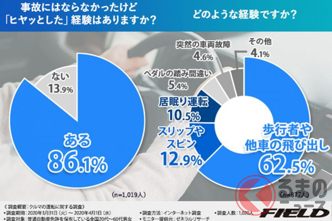 事故にはならなかったがヒヤッとした経験があるかを聞いてみると、なんと8割以上の人が「ある(86.1%)」と回答する結果となりました。 運転中のヒヤリは、もはや日常茶飯事といえそうです。