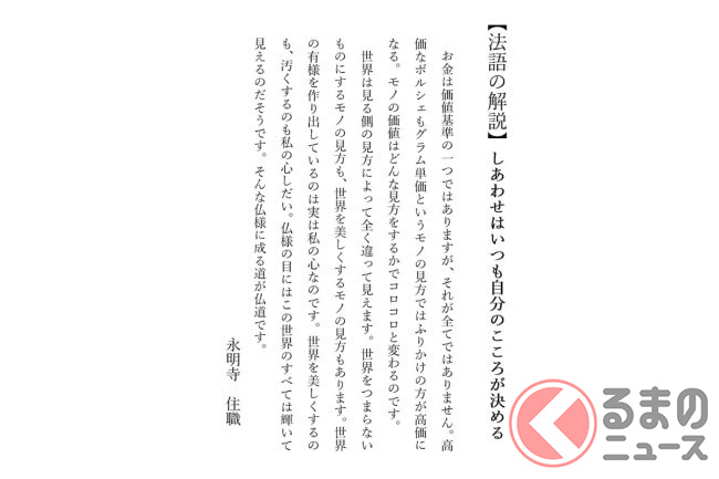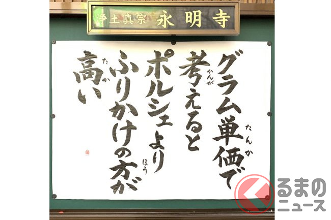 福岡県北九州市にある浄土真宗本願寺派 永明寺の住職が、自身のTwitter(@matsuzakichikai)に「掲示板の法語を替えました モノの見方で世界は変わるのです」との言葉と併せて、「グラム単位で考えると ポルシェよりふりかけの方が高い」と書かれた掲示板の写真を投稿し、話題を集めています。
