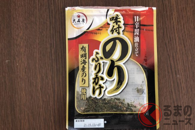 偶然、編集部員の家にあった大森屋の「味付け海苔ふりかけ」で比べてみました。こちらも、公式サイトによると、味付け海苔ふりかけの価格は27g入りで、220円。グラム単位に換算すると、約8.15円。ケイマンより約2.55円高いことになります。