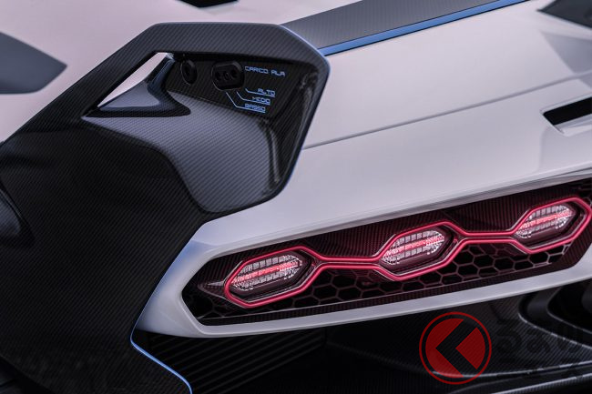 リアセクションは、3つの異なるポジションに設定可能な大型カーボンファイバー製ウイングで覆われている。