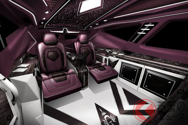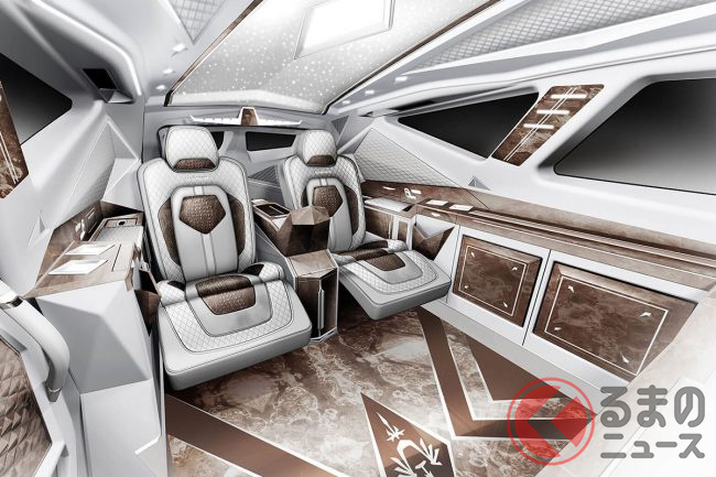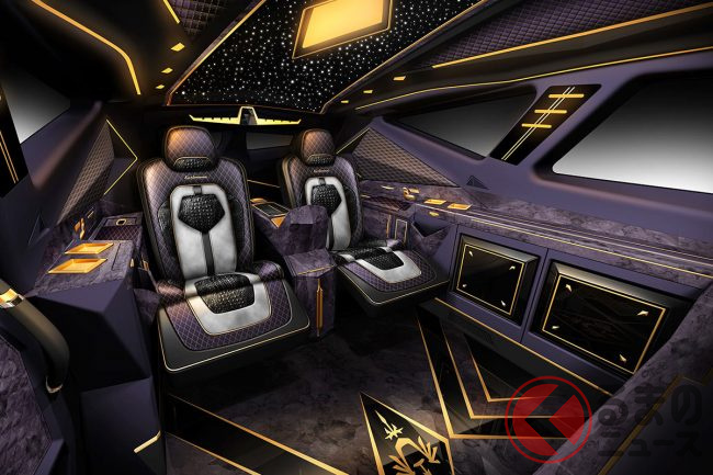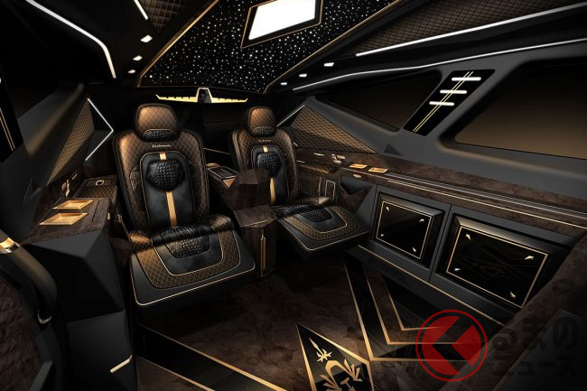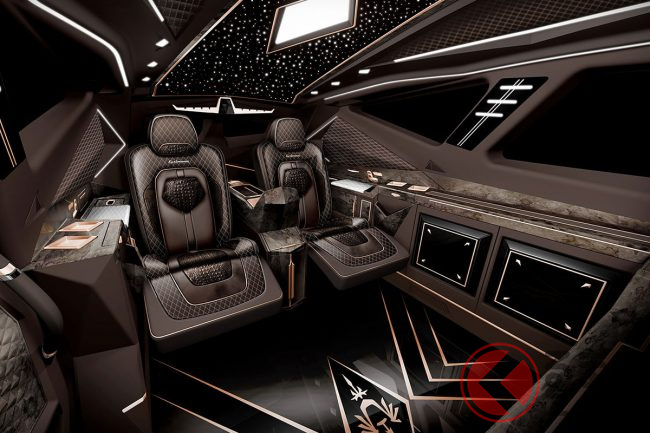 ボディはスチールとカーボンで構成され、防弾仕様も発注でき、インテリアもド派手で広大、高級ラウンジ顔負けの豪華絢爛な作りとなっています。