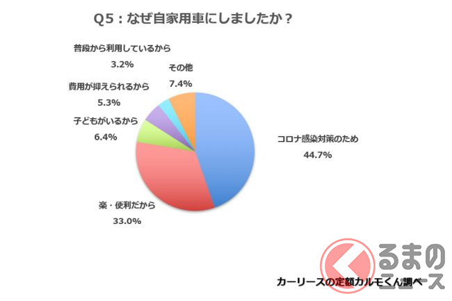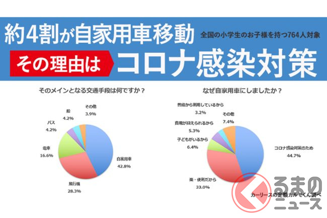 続いて、旅行でのメインとなる交通手段として自家用車を選んだ人に理由を聞いたところ、「他人と会わずに済み、密が避けられるから」や「新型コロナの感染対策としてクルマは安心」など、約半数が「新型コロナ感染を避けたいから」という理由を挙げています。