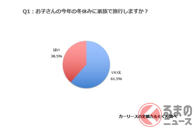 まず、子どもの冬休みには家族で旅行をするかを聞いた結果は、「旅行しない」が61.5%(470人)、「旅行する」が38.5%(294人)となりました。
