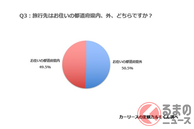 続いて、旅行すると回答した人に、旅行先は居住地の都道府県内、外のどちらかを聞いたところ、「都道府県外」が50.5%、「都道府県内」が49.5%という結果。夏休みの調査では、都道府県内が61.2%と、都道府県外の38.8%を上回っていたので、冬休みは夏休みよりも遠出をしようとしている人の割合が大きくなっているようです。