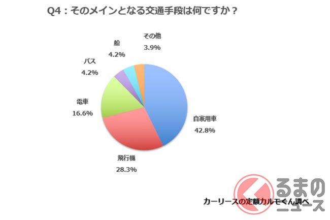 さらに、旅行すると回答した294人に、メインとなる交通手段を聞いたところ、「自家用車」が42.8%と半分近くを占め、「飛行機」が28.3%、「電車」が16.6%、「バス」と「船」がいずれも4.2%という結果になりました。また、その他にはレンタカーやカーシェアなどの回答があり、これは夏休みの交通手段の割合ともほぼ同じです。