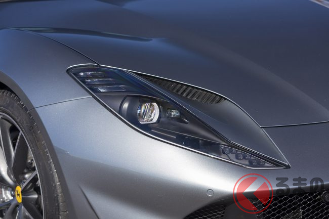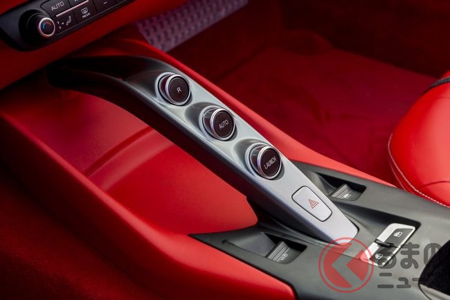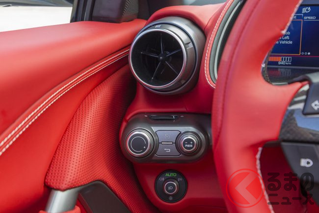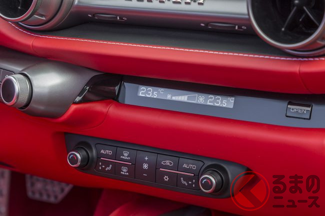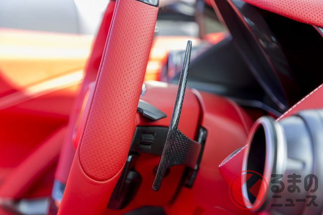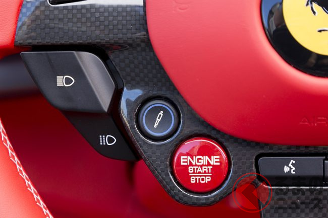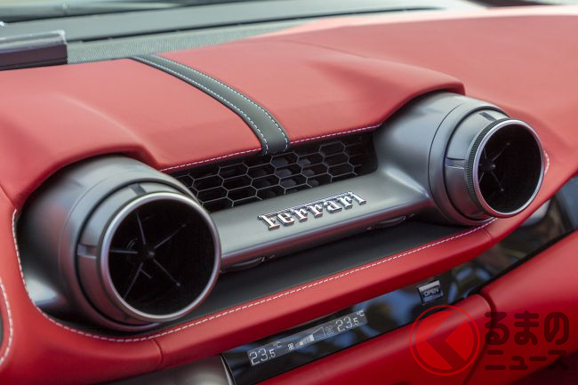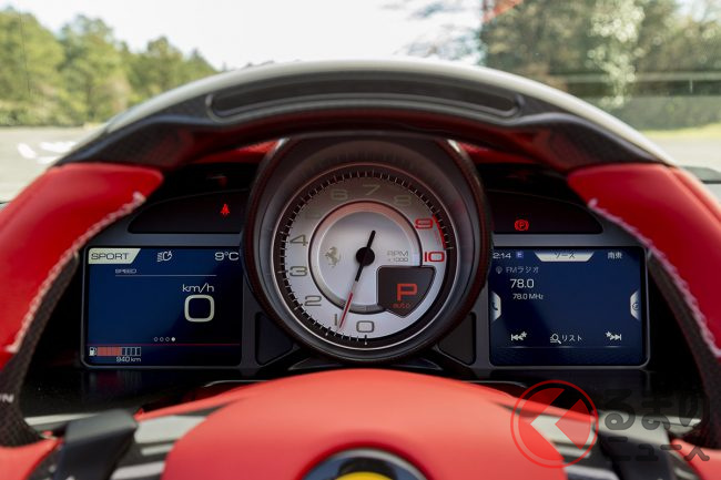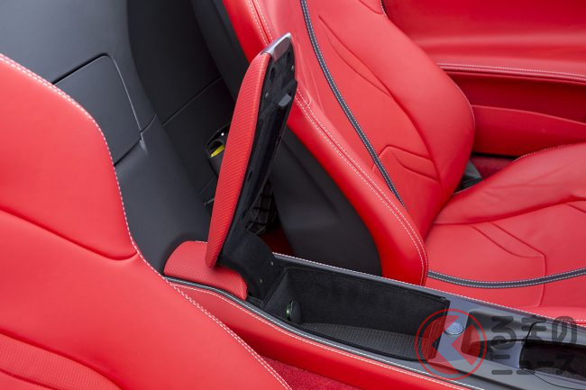 ボディサイズは全長4693mm×全幅1971mm×全高1278でmm。市街地ではやや全幅方向の大きさが気になるものの、例によってフェラーリのフロントフェンダーには鮮明な峰が存在するので、ボディサイズに慣れるのは早い。左右後方の視界はさすがに限られてしまうが、アラーム機能を備えるドアミラーの恩恵で、高速道路上での車線変更などの負担が少ないのは嬉しい。