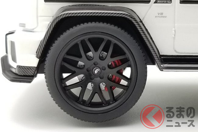 ホイールは、米国ロサンゼルスを拠点とするフォージアートのホイールがセンターキャップのロゴまで再現されており、ブレーキキャリパーにもAMGのロゴがプリントされているという凝りようだ。また、LBWK仕様に近づけるためにボディのカーボンパターンも忠実に再現されている。