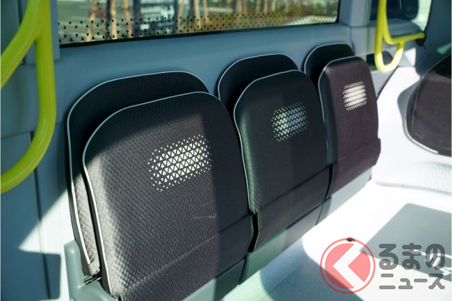 定員はオペレーターを含んで20人となっており、人を乗せる仕様だと8席+1席+つり革3本。電気自動車になっており、運用上の想定最高速度は19km/hとのこと。